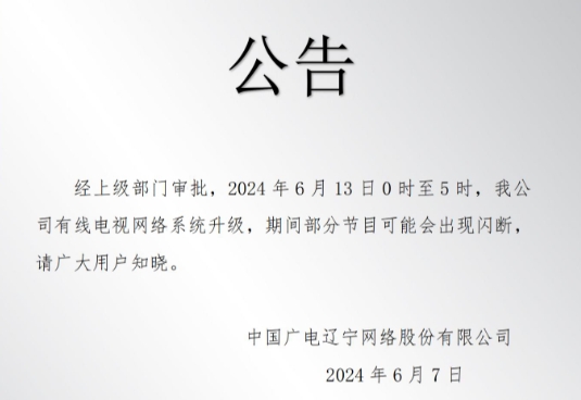 经上级部门审批,2024年6月13日0时至5时,我公司有线电视网络系统升级,期间部分节目可能会出现闪断,请广大用户知晓。