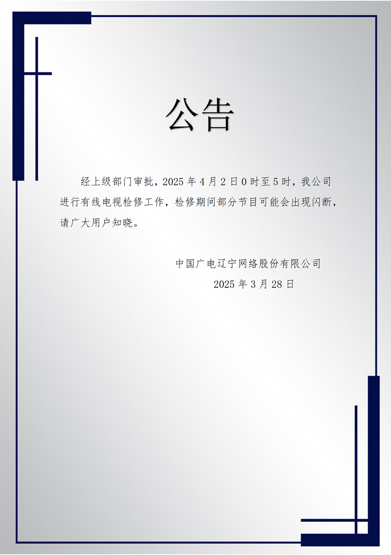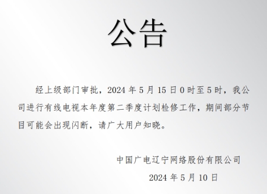 经上级部门审批,2025年3月20日0时至5时,我公司进行本年度第一次有线电视计划检修工作,检修期间部分节目可能会出现闪断,请广大用户知晓。