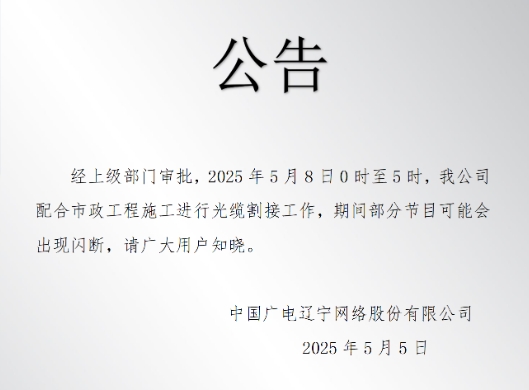 经上级部门审批,2025年5月8日0时至5时,我公司配合市政工程施工进行光缆割接工作,期间部分节目可能会出现闪断,请广大用户知晓。