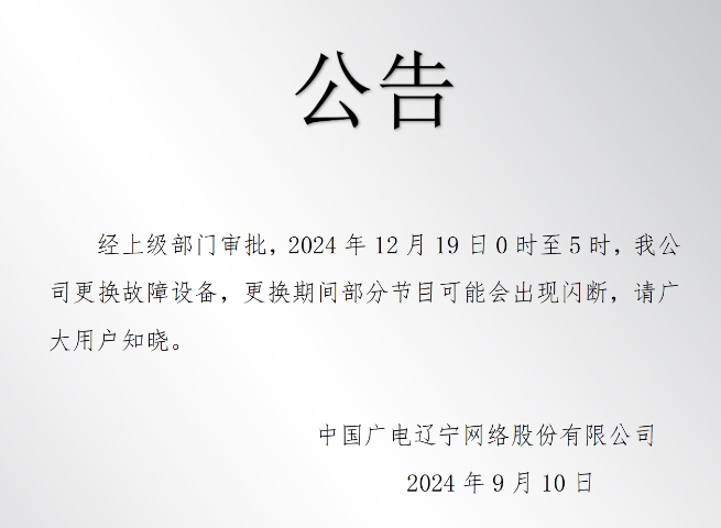 经上级部门审批,2024年12月19日0时至5时,我公司更换故障设备,更换期间部分节目可能会出现闪断,请广大用户知晓。