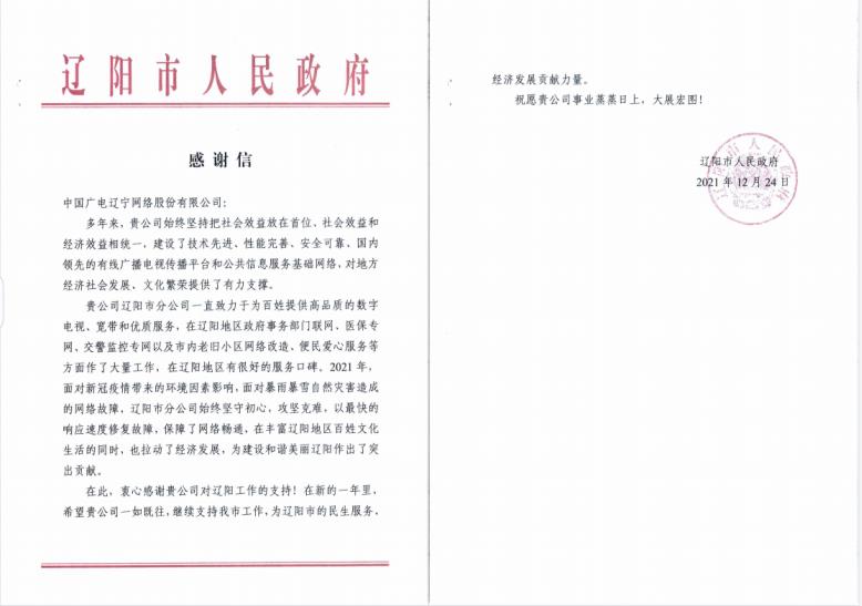 2021年12月24日,bw必威西汉姆联官网(简称bw必威西汉姆联官网)收到来自辽阳市人民政府的《感谢信》。这封热情洋溢的感谢信,字里行间体现着辽阳市人民政府对bw必威西汉姆联官网辽阳市分公司始终致力于为百姓提供高品质数字电视、宽带和优质服务的崇高敬意,对辽阳市分公司干部员工争做新冠疫情“逆行者”,快速修复暴雨暴雪自然灾害造成的网络故障,确保有线电视网络畅通的充分认可和高度赞誉。