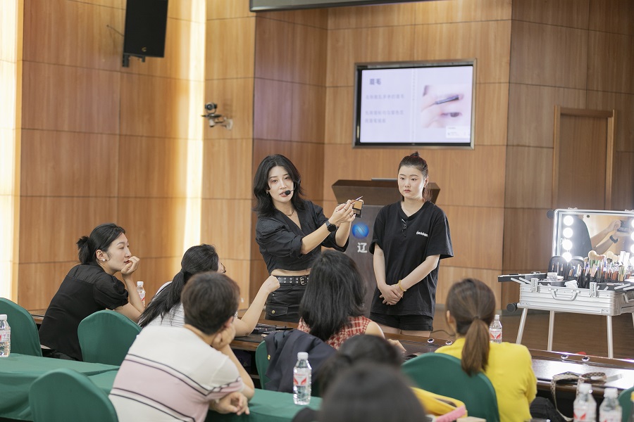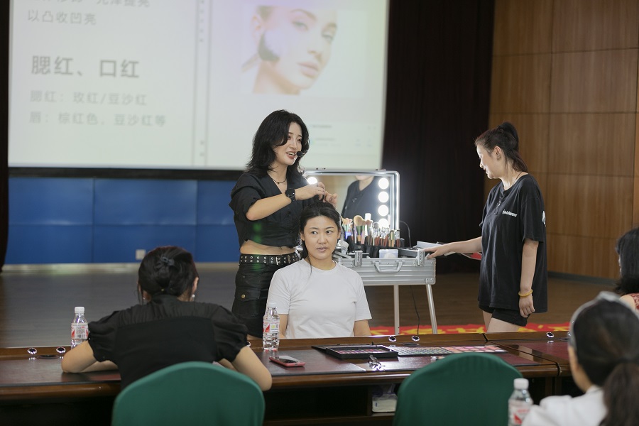 黄晓秋老师现场讲解了基础护肤的步骤,围绕不同肤质的特点和不同年龄的女性对化妆品、化妆工具、底妆和彩妆的选择等方面给学员们讲解化妆的基本知识,从打底开始,修眉、画眉、画眼线、上眼影……逐一演示日常妆容的化法,并邀请学员现场进行化妆技巧教学示范。