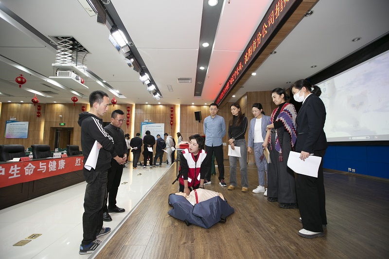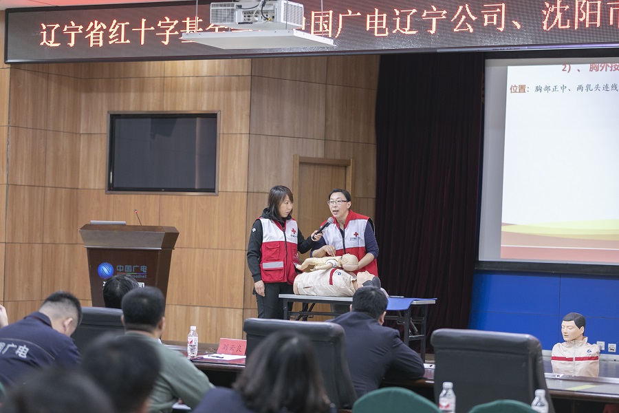 辽宁省红十字应急救护志愿服务队赵俊秀现场为学员演示心肺复苏(CPR)步骤