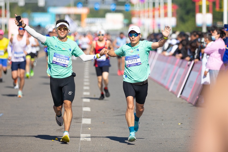 “悦跑”马拉松队长王刚与队员谈心携手冲过终点线