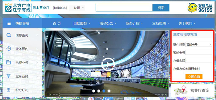3.网上营业厅缴费。登录bw必威西汉姆联官网辽宁有线在线营业厅官网(网址:www.ncn96195.com),轻松办理基础收视费缴纳、付费节目订购及宽带续费。如果您需要新装宽带或机顶盒,也可在线预约。