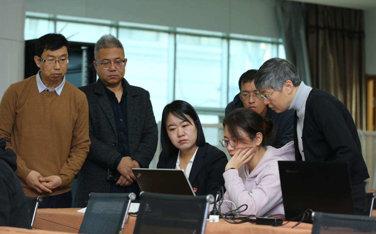 公司党建工作部工作人员(左三)指导参训的同志进行软件操作