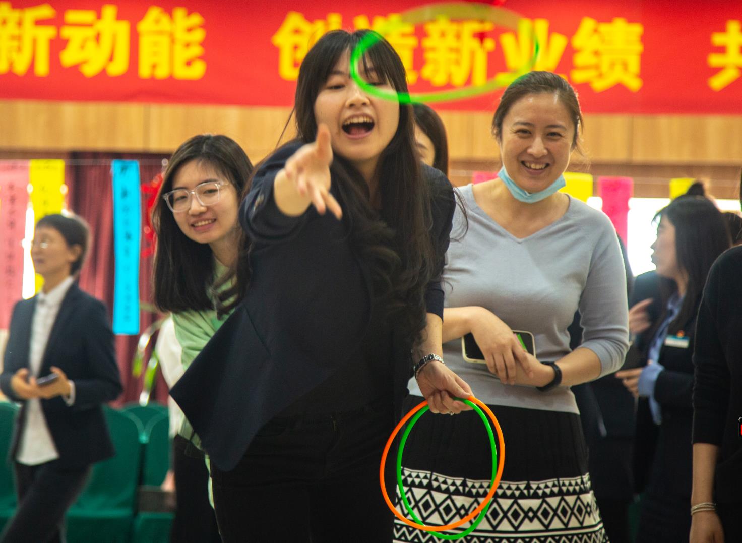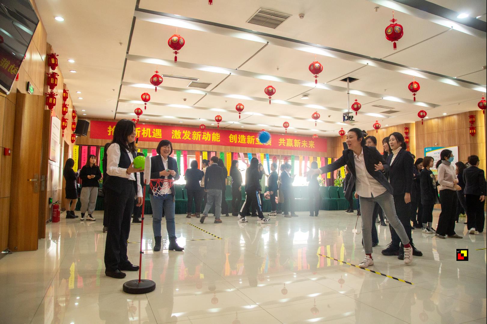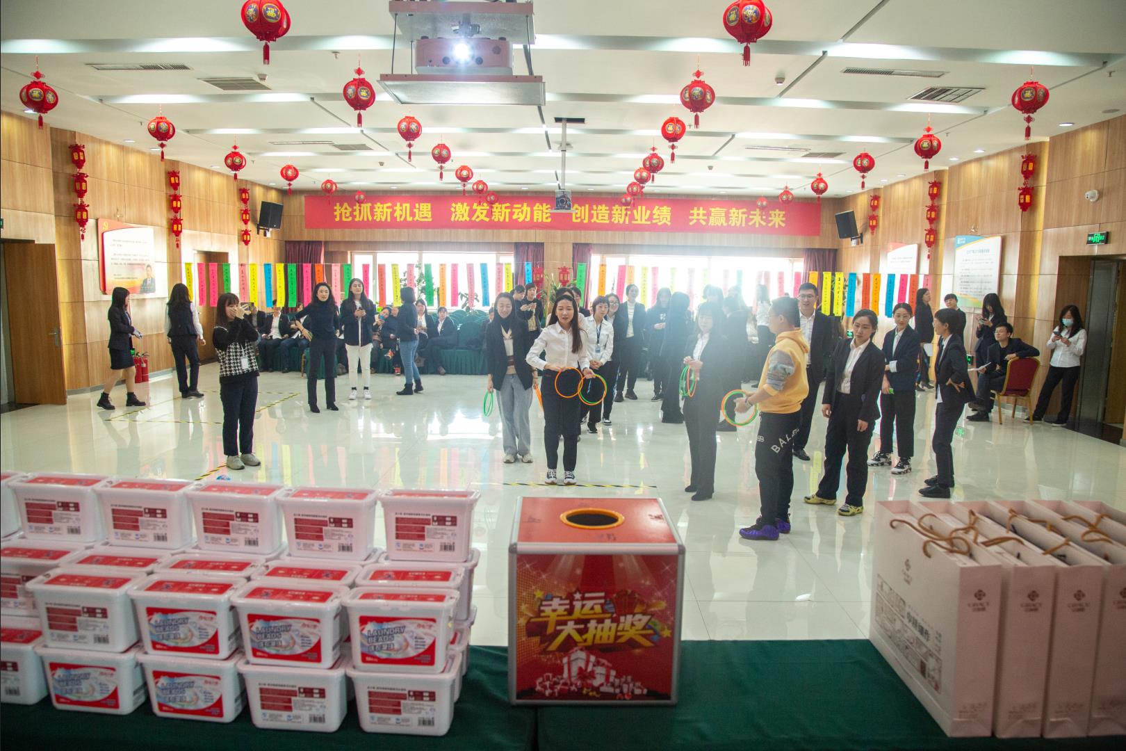 活动现场,加油声、笑声、欢呼声不绝于耳,洋溢着一片和谐、热烈的氛围。猜谜语者冥思苦想,绞尽脑汁;套圈圈者全神贯注,小心翼翼;单人跳绳者轻燕飞舞,精彩纷呈;定点投篮者屏息凝神,动作迅捷;投飞镖者沉着冷静,精准投掷。幸运抽奖悬念从生,气氛热烈,点燃了全场女员工的热情。