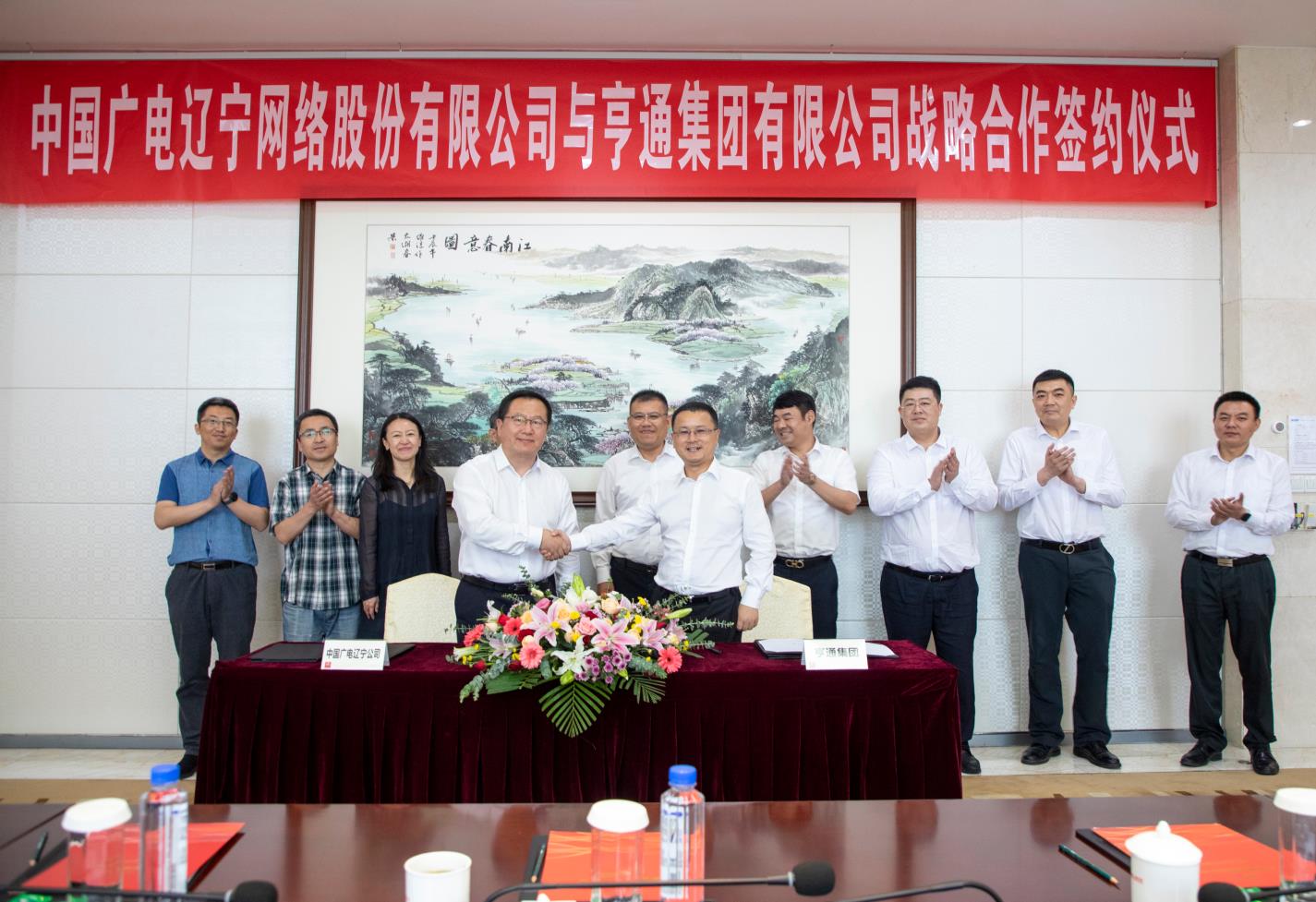 2021年6月4日上午,bw必威西汉姆联官网(简称辽宁广电)与亨通集团有限公司(简称亨通集团)战略合作协议签约仪式在苏州亨通集团总部举行。辽宁广电党委书记、董事长、总经理曾绍武,总工程师王兆恒,总经理助理王婷与亨通集团执行总裁钱建林,运营管理中心总经理尹纪成,通信产业集团副总裁、亨通光电总经理张建峰出席了签约仪式。
