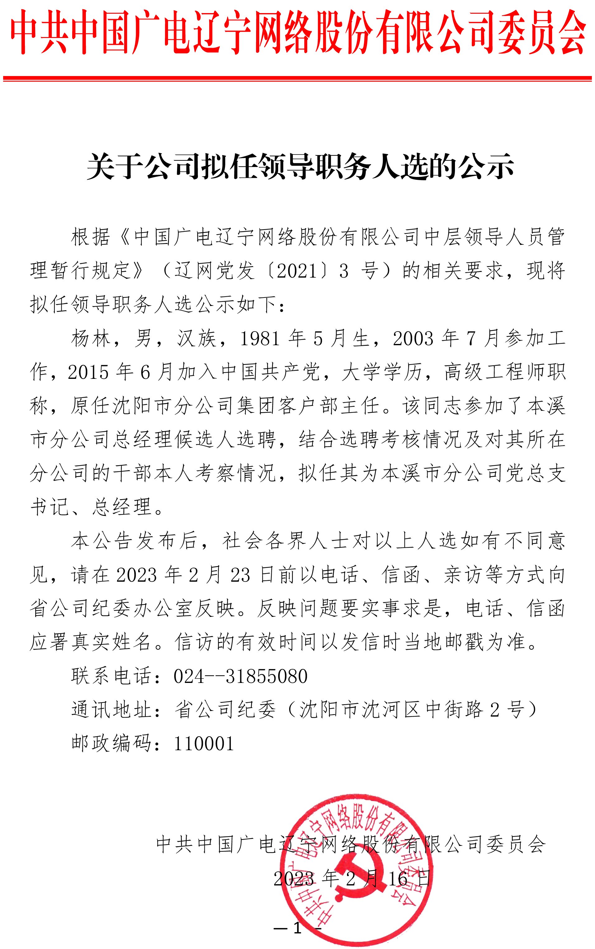关于公司拟任领导职务人选的公示