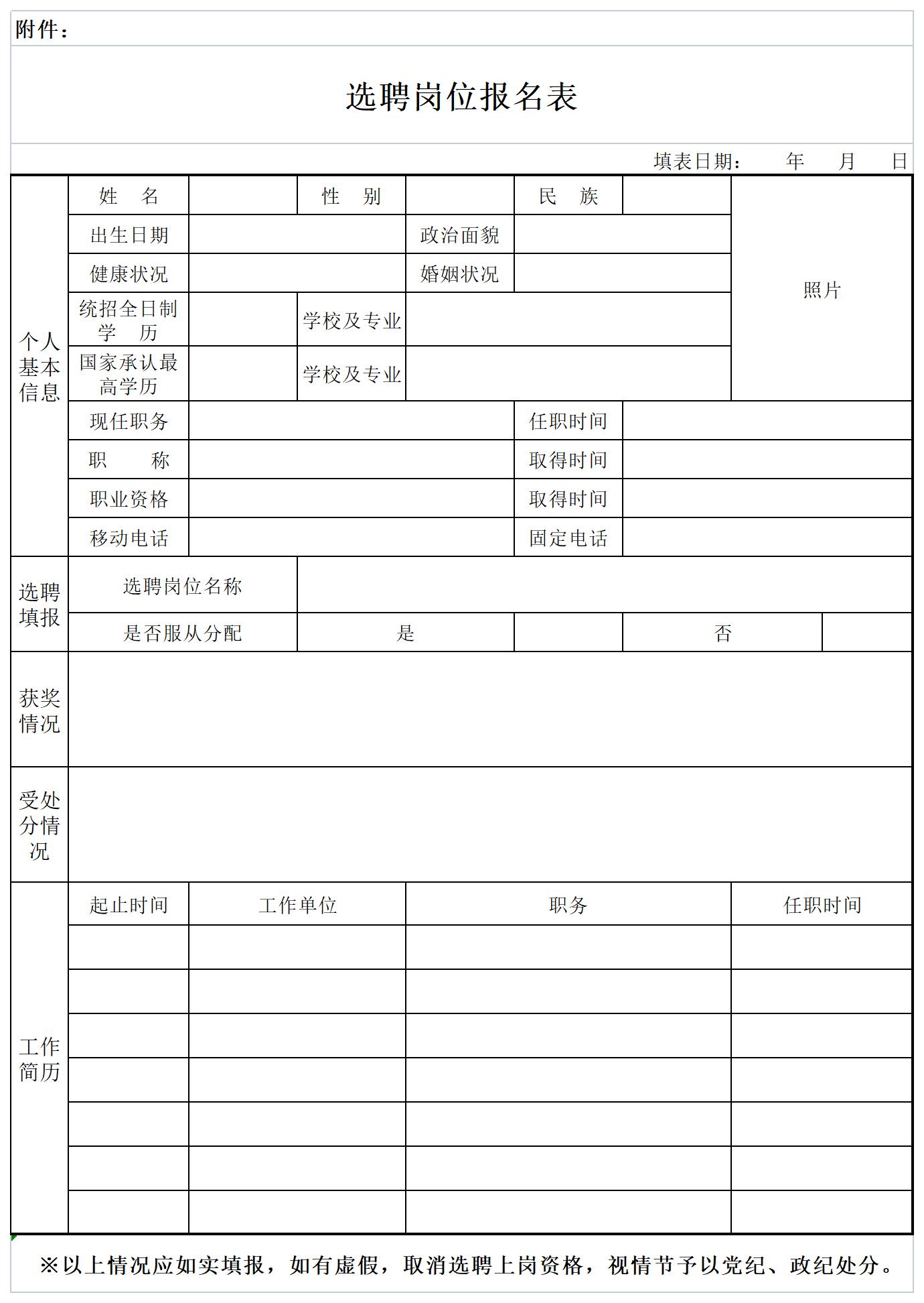 1.参与选聘人员需填写《选聘岗位报名表》,于10月9日17:00前通过邮箱(9020029@QQ.com)提报选聘工作领导小组办公室,并电话告知联系人。电子版文件名的编写为统一格式,具体为:现单位+现岗位/职务+姓名;