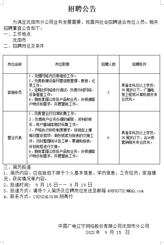 联系人: 鞍山市分公司 简历投递邮箱:99401884@qq.com